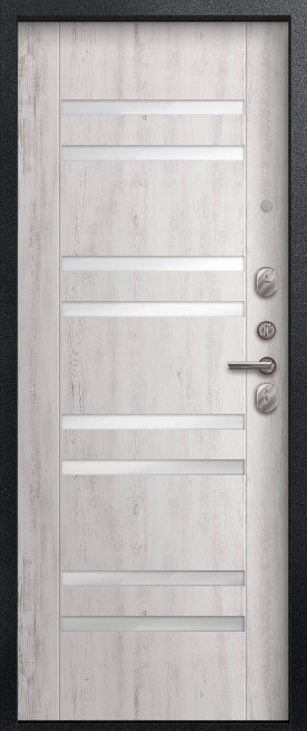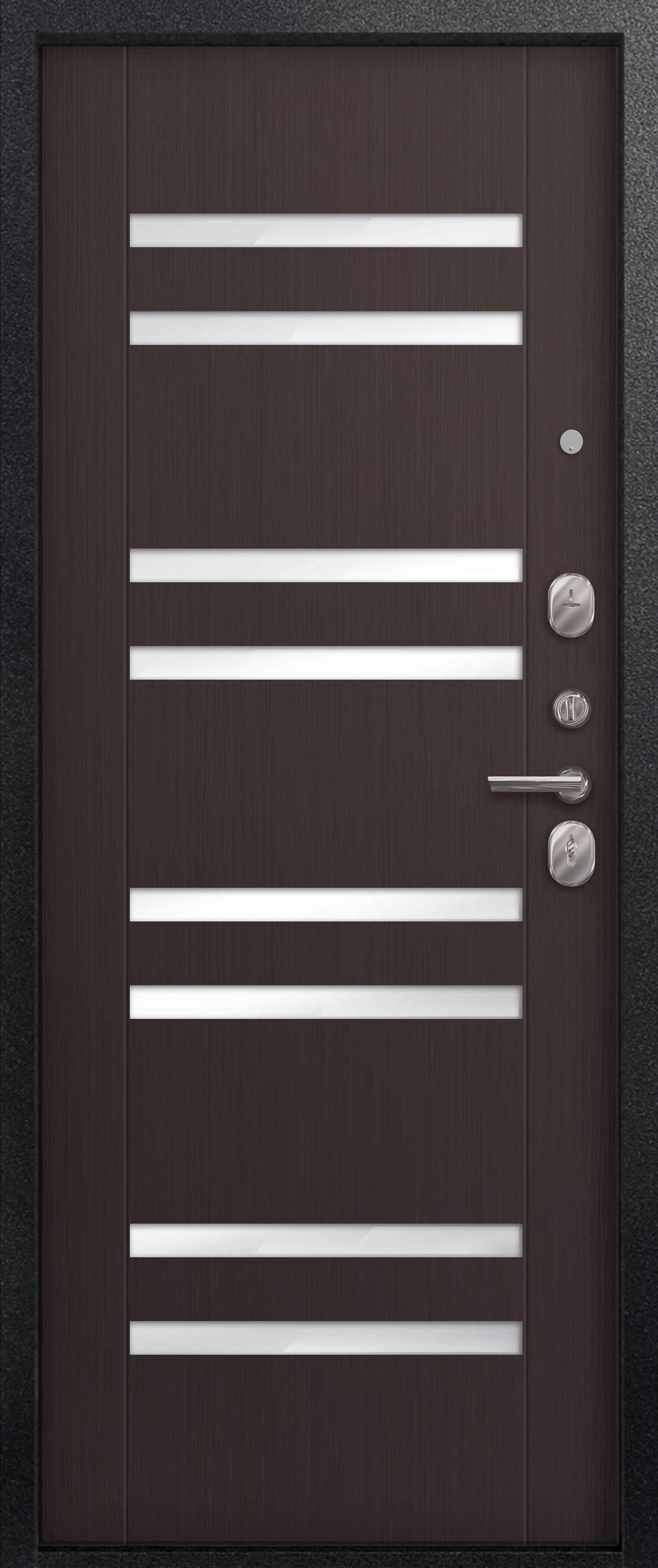 Мы используем сталь толщиной 1 мм., что обеспечивает достаточную прочность при умеренной массе готового изделия. Для обеспечения дополнительной жесткости конструкции используется технологический вертикальный гиб(штамп) с внешней стороны полотна. Наполнитель двери – пенополистирол, двойной слой которого обеспечивает тепло и шумоизоляцию двери.